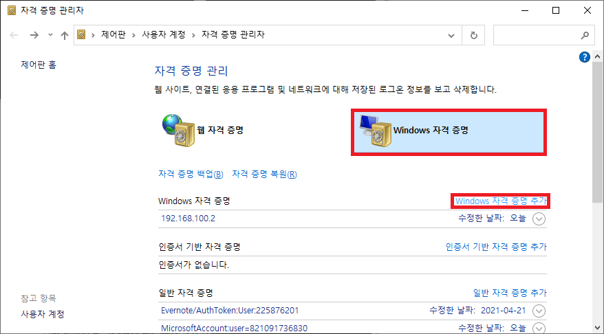 만약 비밀번호 오류라고 나오시는 분들은 자격 증명 관리자에서 접속하고자 하는 네트워크 드라이브의 자격 정보를 기입해야 합니다.