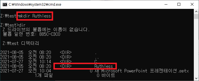 등록을 완료 후 다시 시도 하니 정상적으로 연결이 되었네요 dir 명령을 통해 접속된 네트워크 드라이브에 존재하는 폴더를 확인해보시면 잘표시가 되실 겁니다.