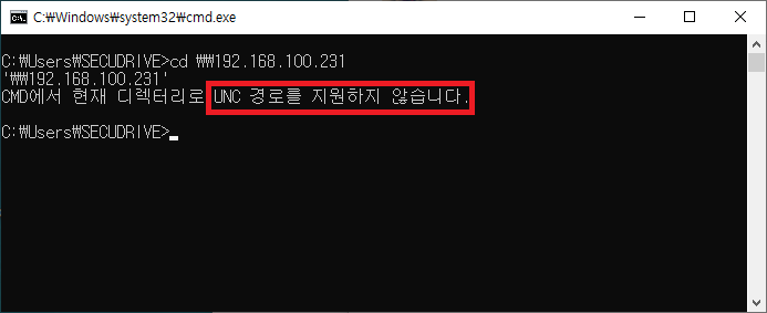먼저 일반적으로 알고 있는 명령어를 통해서 네트워크 폴더에 접속하고자 한다면 아래와 같이 UNC 경로를 지원하지 않습다라는 메세지가 표시됩니다.