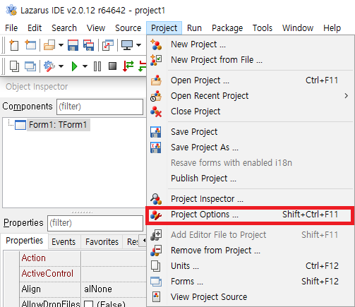 IDE 상단 메뉴 중 Project < Project Options 클릭합니다.