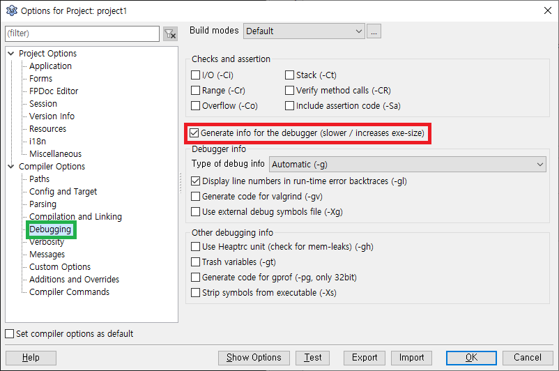 Project Option 좌측 메뉴에서 Debugging을 선택 후 Generate info for the debugger (slower / increases exe-size) 체크 박스를 해제합니다.